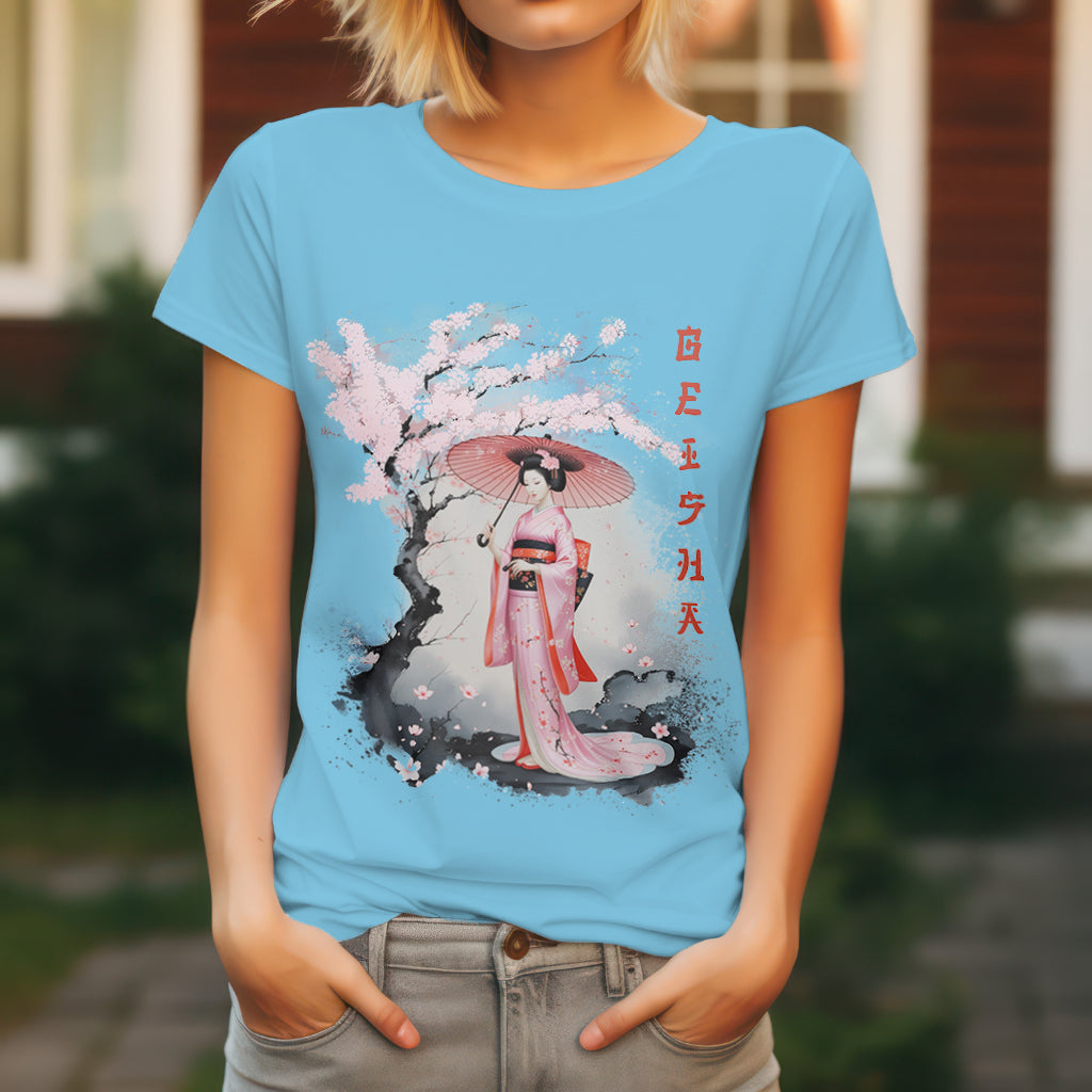 Step into elegance with the Trithya Umbrella Girl T-Shirt, featuring a beautiful geisha and cherry blossom design. Crafted from 100% premium cotton, this tee combines comfort with artistic charm — perfect for adding a touch of tradition to your everyday style.